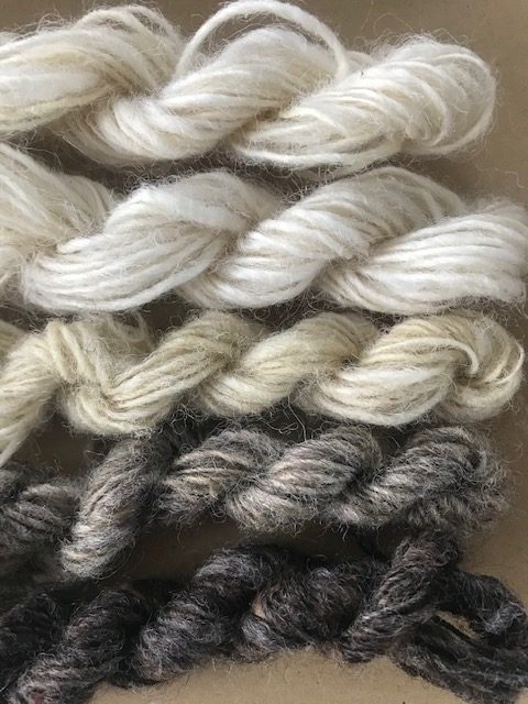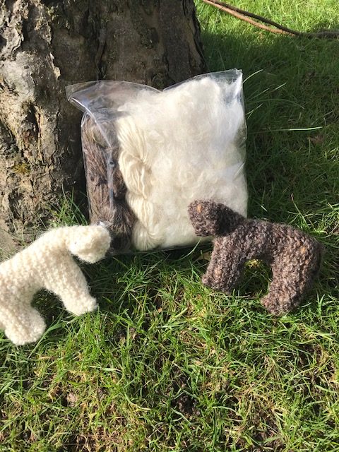 A simple knitting project. This kit provides black and white natural undyed home spun wool to make 2 lambs. Hand drawn instructions are also included as well as washed sheep’s wool for the filling.