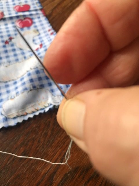 Threading up the needle . Put thread tight over the top of the needle. Pull it off