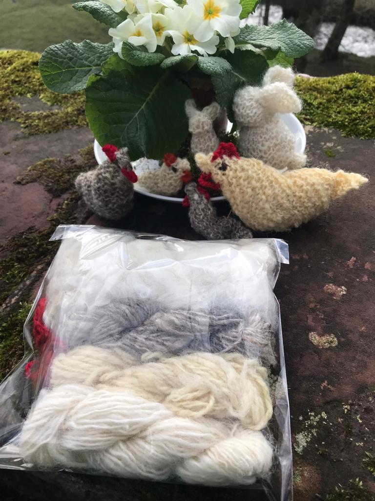 Includes hand spun wool in natural undyed colours (16 metres each colour) – golden yellow, grey and white . Makes two chickens and two chicks, one medium bunny and one small bunny. Washed white sheep’s wool for stuffing each animal and a little red wool for the crown. Simple hand written instructions included too. If you would like extra skeins of other natural colour wool please contact me on the email form below. They cost £2 for a 16 meter skein and £3 for 25 meters.