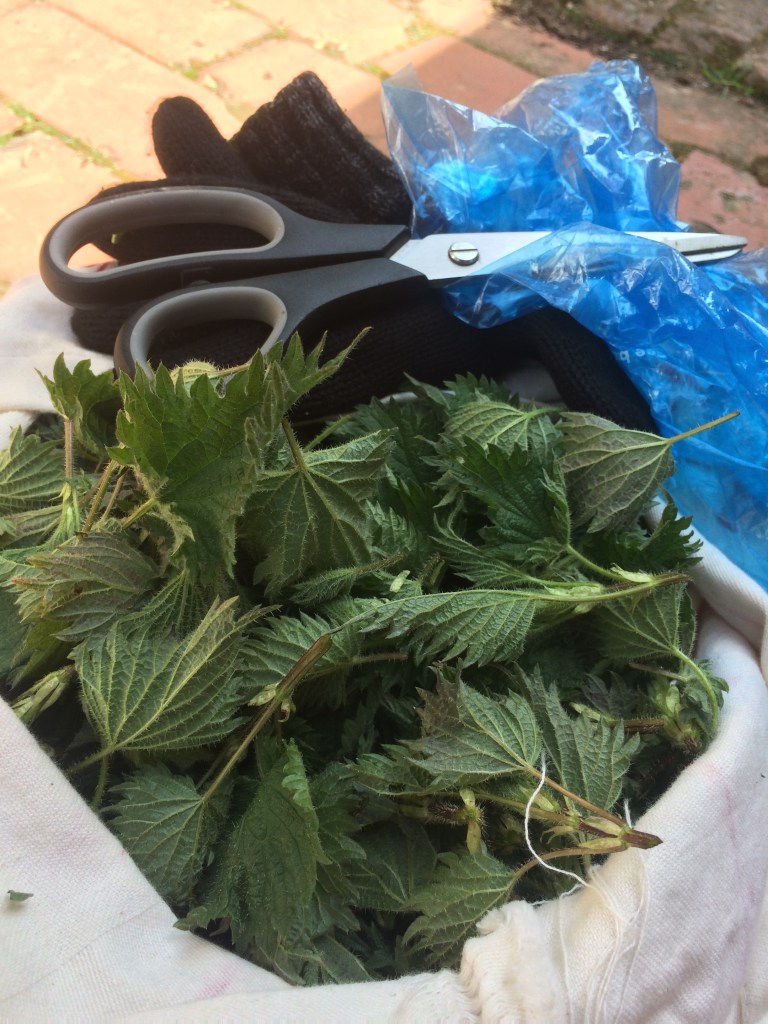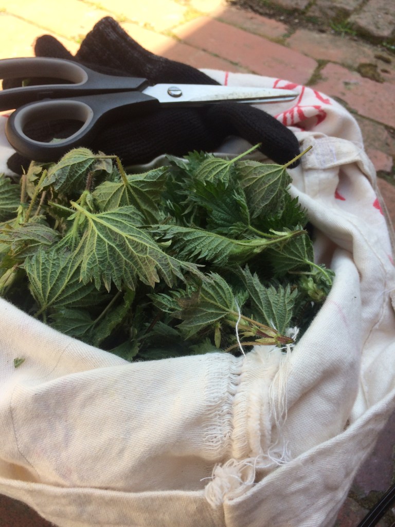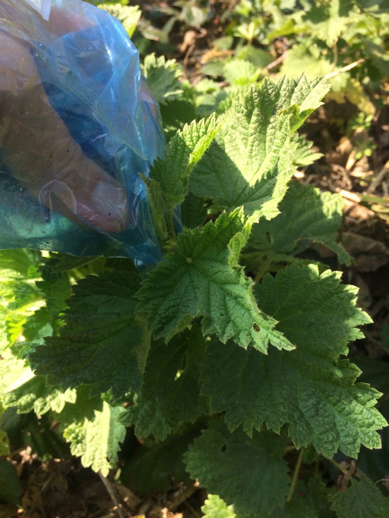 Cut the head of the young nettle using a glove or plastic bag on your hand to grasp the nettle. (Be careful you only collect from areas that dogs don’t frequent!)