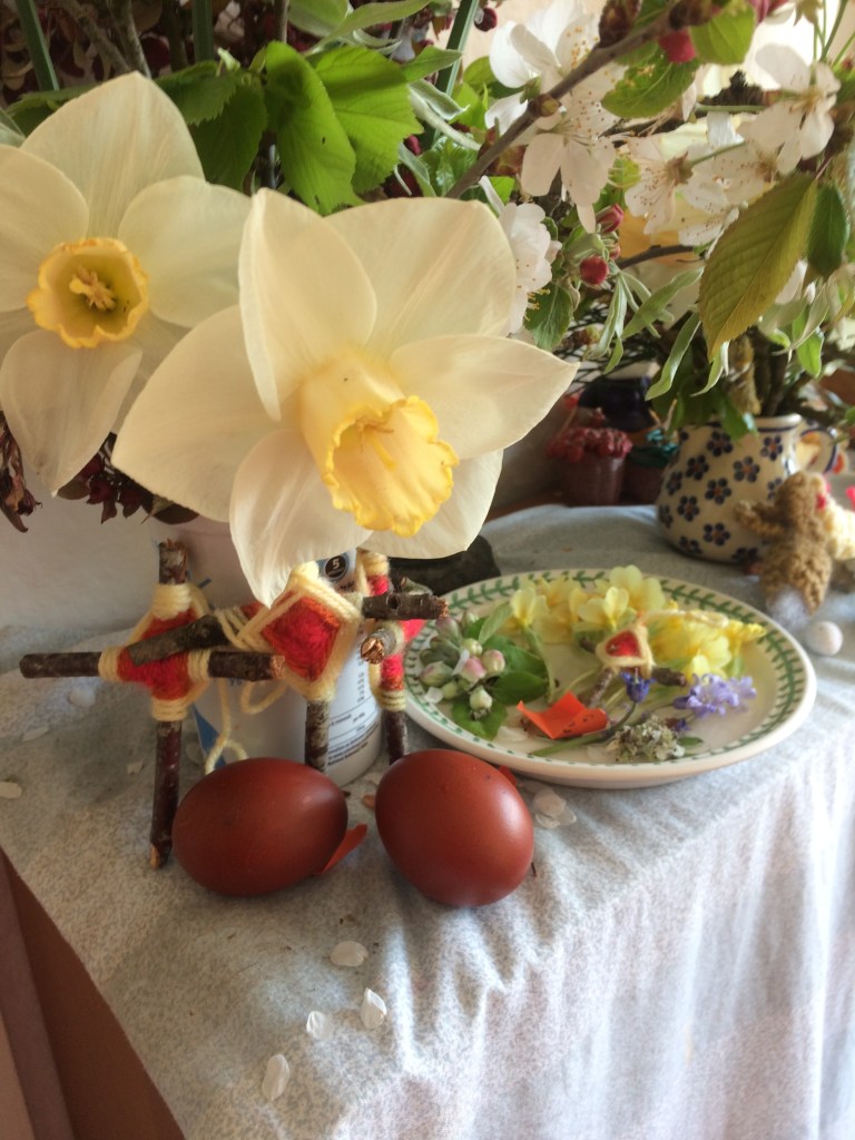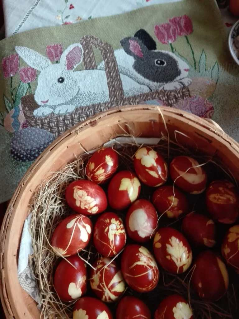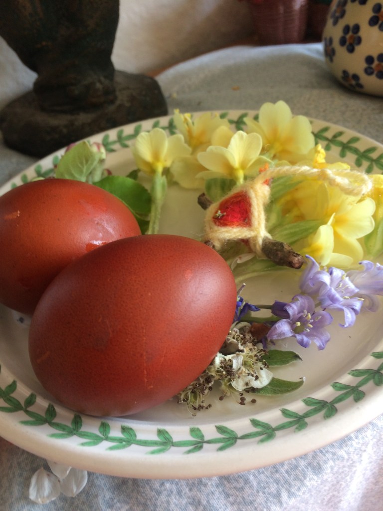 Yet another alternative we have often done is to boil your eggs, take them out the water, then each person in your family or friends use coloured crayons to ‘paint’ a design while it is still hot. The crayons melt on to the shell. Cradle your hot egg in a cloth rag or old tea towel whilst doing this.