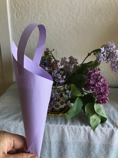 Use an oblong piece of paper and turn it into a funnel shape. Attach a handle and you can hang it on someone’s door with flowers, blossom, and sweet smelling Lilac ..a happy awakening present to this beautiful month of May.